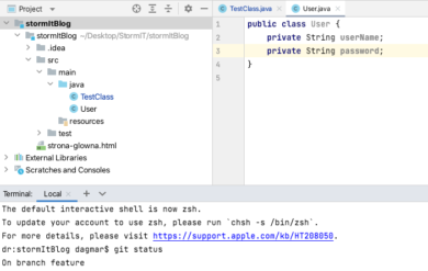 Na początek spójrzmy na branch feature. Posiada on dwie klasy TestClass oraz User.