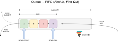 Wszystkie elementy w kolejce – czy to w kolejce danych, czy w kolejce osób w sklepie zwyczajowo zachowują się zgodnie z FIFO (ang. First In, First Out) – czyli w dosłownym tłumaczeniu: pierwszy na wejściu, pierwszy na wyjściu. Pomijamy na chwilę przypadek z przepychankami kolejkowymi, zakładamy, że każdy będzie grzecznie stał i czekał na swoją kolej.