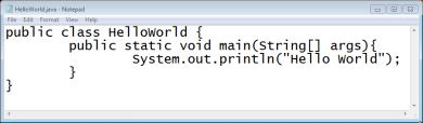 Przykładowa aplikacja będzie składała się z jednej klasy o nazwie: HelloWorld, która będzie umieszczona w pliku tekstowym o nazwie: HelloWorld.java. Nazwa pliku ma bardzo duże znaczenie. W Javie w jednym pliku może znajdować się tylko jedna klasa publiczna, a plik musi mieć nazwę taką samą jak ta klasa i rozszerzenie: java.