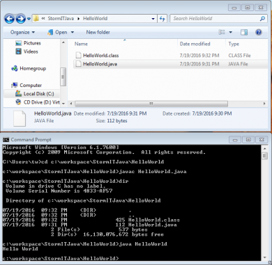 Kompilator powinien utworzyć w tym samym katalogu plik o tej samej nazwie, ale o rozszerzeniu class, czyli HelloWorld.class. Plik zawiera bytecode, czyli instrukcje wykonywane przez wirtualną maszynę Javy.