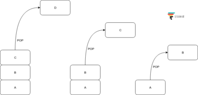 Metoda stos pop (ang. stack pop) zwraca pierwszy element ze stosu, jednocześnie go zdejmując – czyli bierzemy jedną rzecz z samej góry stosu i ją zabieramy. Przez co, po wykonaniu tej metody, wskaźnik head wskazuje na element, który był niżej w stosie lub – jeżeli nie mamy już elementów – to head = null.