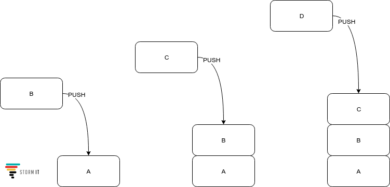 Metoda stos push (ang. stack push) polega na dodaniu nowego elementu – „kładziemy” nowy element na wierzchu stosu i od teraz wskaźnik head wskazuje właśnie na ten element.