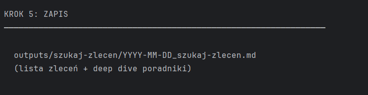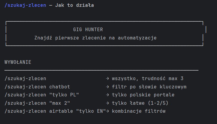 To skill Claude Code – czyli komenda, którą uruchamia się z terminala. Wpisujesz /szukaj-zlecen i dostajesz listę aktualnych zleceń na automatyzacje, z oceną trudności, szacunkiem Quick Win Score i podpowiedzią jak podejść do tematu.