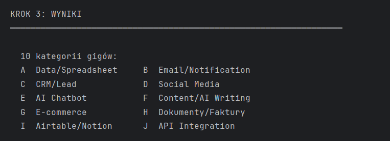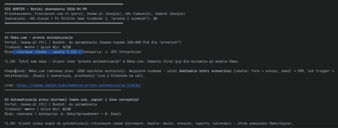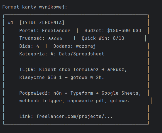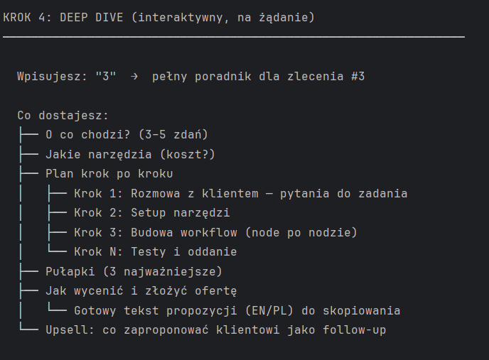 Wpisujesz jedną komendę. Kilka minut później masz posortowaną listę zleceń z oceną trudności, szacunkami budżetów i gotowym poradnikiem jak podejść do każdego z nich.