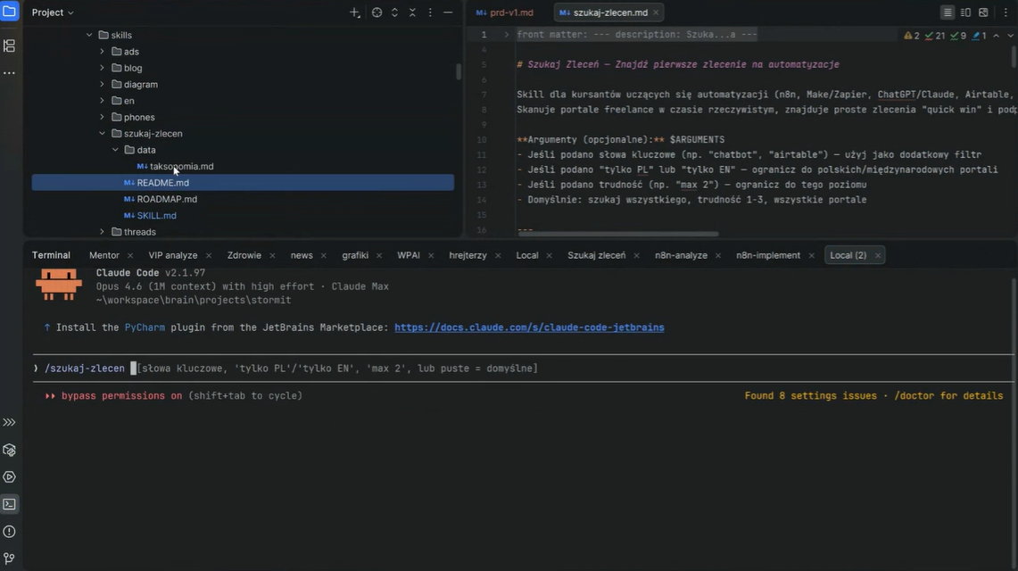 /szukaj-zlecen powstał na VIP Masterclass StormIT, jako odpowiedź na pytanie „jak w ogóle znaleźć pierwsze zlecenie?". Na każdym spotkaniu budujemy od zera narzędzia Claude Code, które rozwiązują realne problemy w pracy freelancera i wdrożeniowca AI. Jeśli chcesz tworzyć takie automatyzacje samodzielnie – i wiedzieć jak je sprzedawać klientom: