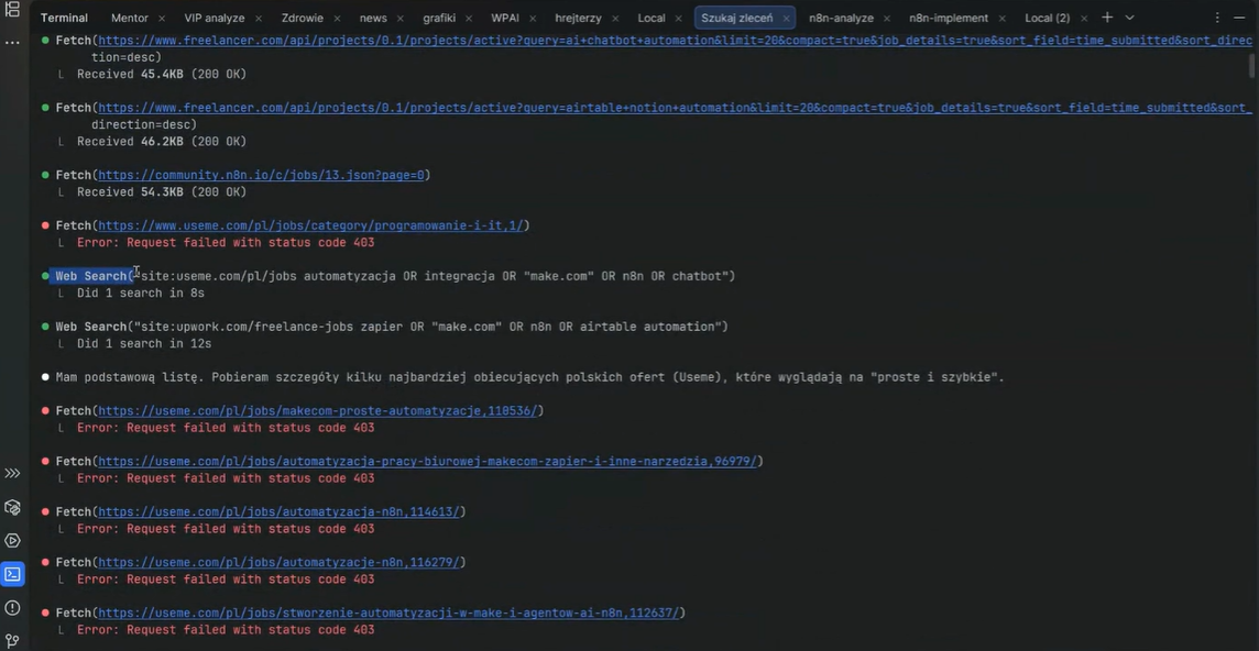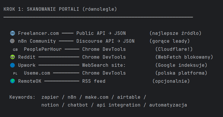 Kiedy uruchamiasz skill, pierwsze co widzisz to lista portali i status pobierania. Freelancer.com odpowiada od razu – ma otwarte publiczne API, które nie wymaga logowania. n8n Community tak samo – Discourse API, JSON, czyste dane.