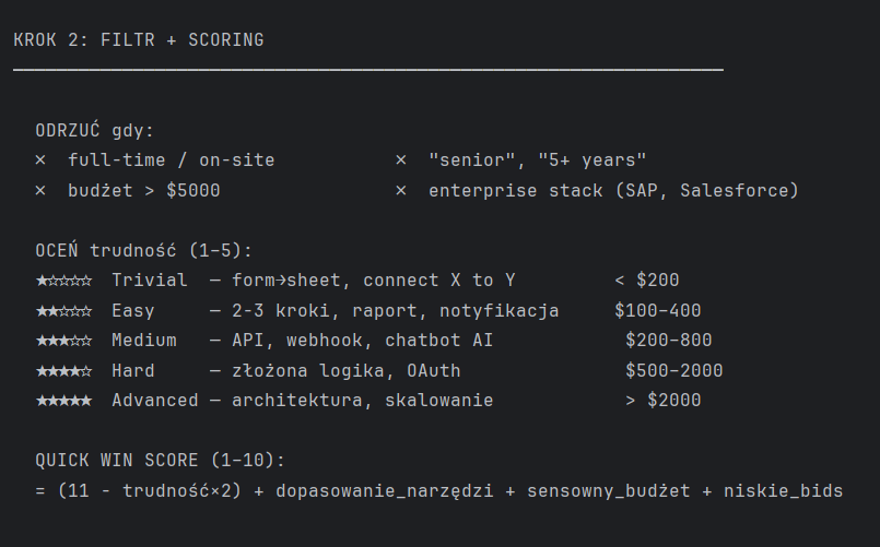 Jeden krok na dziś: odpal /szukaj-zlecen bez filtrów i przejrzyj listę. Jedno zlecenie z Quick Win Score 7 lub więcej to konkretne 30 minut na próbę złożenia oferty lepszej niż „cześć, jestem zainteresowany".