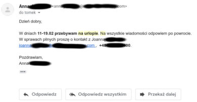 To teraz wyobraź sobie, że ktoś z Twoich współpracowników lub – co gorsza – jakiś ważny klient przez cały Twój urlop wysyła Ci na maila ważne wiadomości.